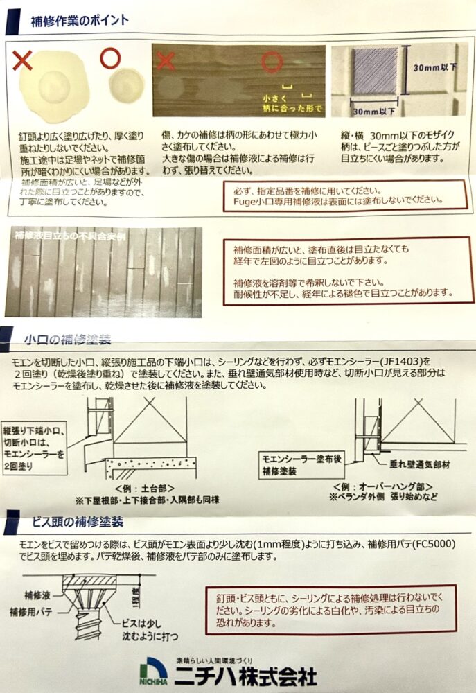 サイディングメーカー ニチハ 補修液 取り扱い説明書👆には 縦張り施工品の小口の塗装をする様書いてあります。